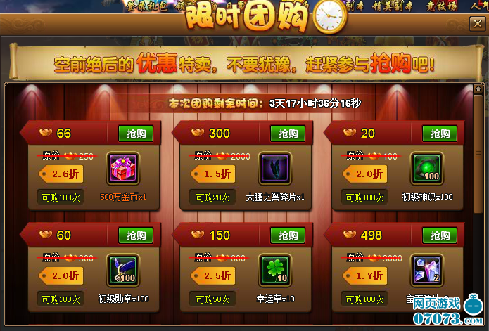 活动内容:在活动期间内,玩家可以在【限时团购】中以超优惠的价格购抢购自己稀缺的各种道具。