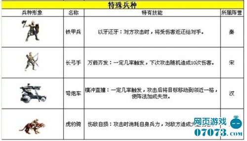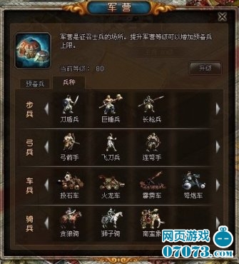 游戏有多达16个兵种以及丰富的养成路线供玩家选择,其中12种为通用兵种,4种为阵营特殊兵种;普通兵种可以通过打败战役特定NPC获得;而特殊兵种则是在玩家选择相应的阵营时自动获得;已获得的兵种可以在主城的军营进行查看,同时兵种的还可以通过书院的科技研究以及军事分城的建筑升级来增强实力游戏有多达16个兵种以及丰富的养成路线供玩家选择,其中12种为通用兵种,4种为阵营特殊兵种;普通兵种可以通过打败战役特定NPC获得;而特殊兵种则是在玩家选择相应的阵营时自动获得;已获得的兵种可以在主城的军营进行查看,同时兵种的还可以通过书院的科技研究以及军事分城的建筑升级来增强实力