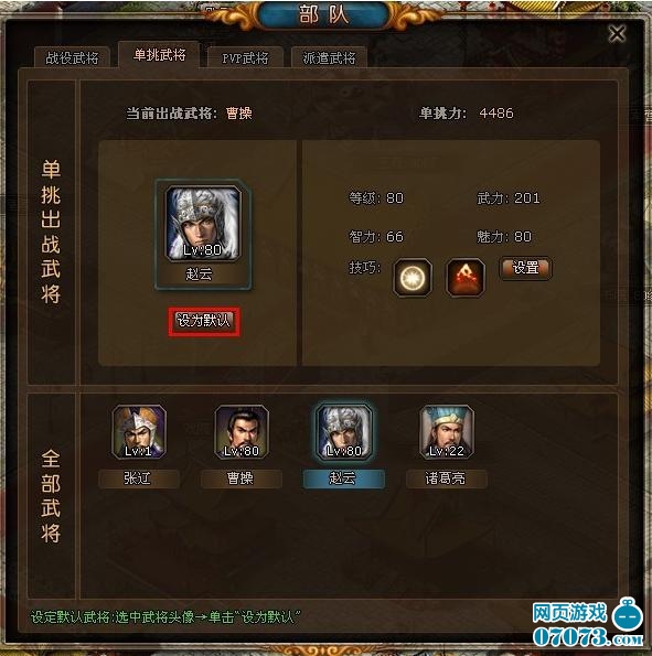 设定单挑战的武将,点击要出战武将头像,然后点击设为默认完成设置;另外在此界面还可以配置该武将的单挑技。
