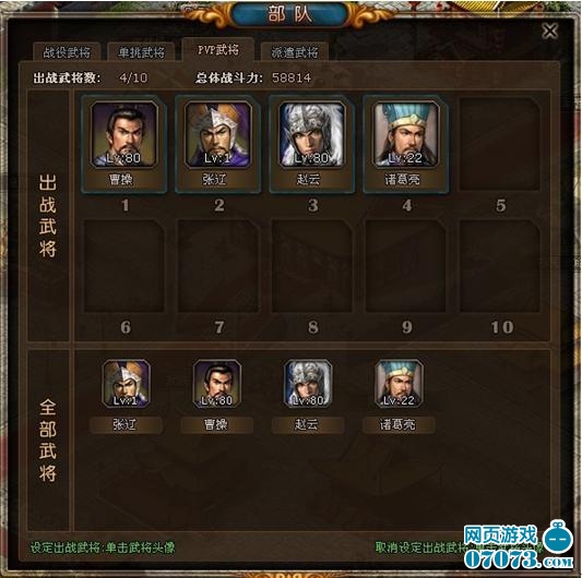玩家可进入部队界面,设定默认的战役武将、单挑武将、PVP武将以及派遣武将,免去了传统游戏中每次出征都需选择出征部队的麻烦。