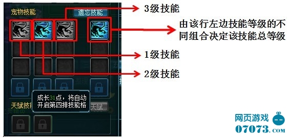 (2)宠物本身除了自带的技能,可以通过系统赠送的宠物秘笈提升技能,还可以通过宠物融合学习到其他宠物的技能。宠物只能学习3行技能(需要成长达到31才能学习第4行技能),每种技能共有3个等级。同一行的技能格在学习了一种技能后就只能学习其他等级该种类技能,同种技能有不同等级存在时。该行第四个技能格的会显示当前总的技能等级。技能总等级的计算公式是:1+2=4,1+3=5,2+3=6,1+2+3=7。