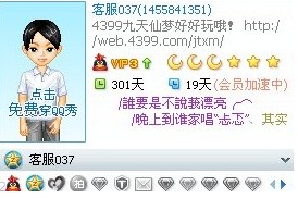1、九天仙梦角色账号需达到30级,参赛的QQ需达到4级(即1个月亮以上)。修改QQ签名,内容必须是祝福九天仙梦的话,且签名必须带有(http://web.4399.com/jtxm/)的网址;