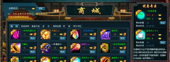 2、玩家在商城消耗元宝购买道具可获得消费返点(返还元宝),消费越多,返点越多,相当于打折购买商城物品。周六日可领取双倍的返点,更加划算!