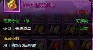 2.通过【锻造】→【道具合成】→【橙装碎片】使用70级橙装碎片合成,每5个70级橙装碎片可合成为一个80级橙装碎片