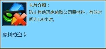 现在,只需花费30个声望购买原来防盗卡,你就可以指定任意一家公司防止其他使用原料偷盗卡的玩家偷取该公司的原材料,有效时间为120小时。