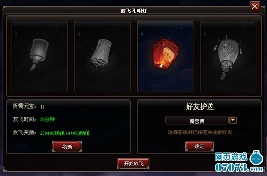 玩家可选择放飞孔明灯的品质(品质由低到高分为绿色、蓝色、紫色、橙色),品质越高的孔明灯放飞后获得的铜钱和功勋奖励越高。