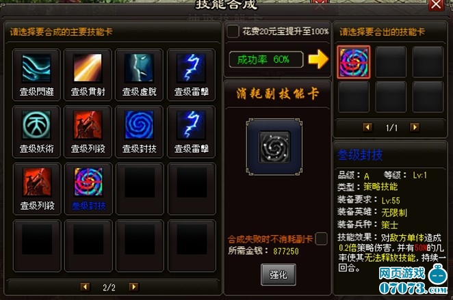 以两张合成一张的方式合成技能卡,合成成功后,技能卡将会提升品级或等级。