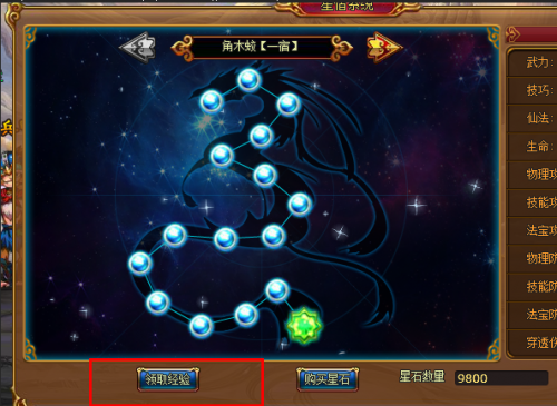 领取经验:点击星石系统左下功能区的领取经验选项。
