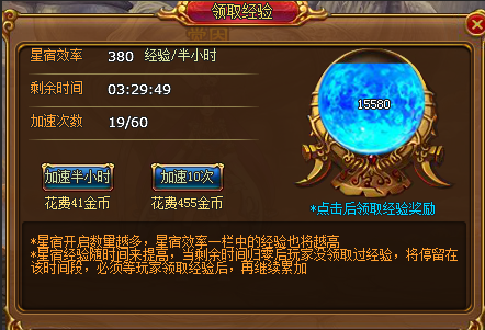 领取经验:星宿开启数量越多,星宿效率一栏的经验也将越高。星宿经验随着时间来提高,当剩余时间归零后玩家没领取过经验,将停留在该时间段,必须等玩家领取经验后,再继续累加。