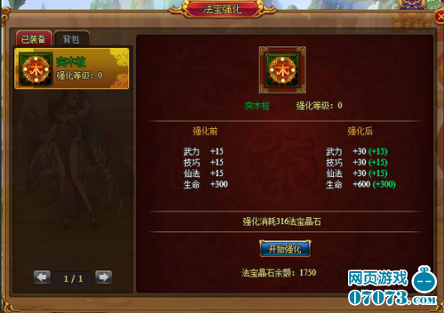 法宝强化:点击开始强化。需要使用法宝晶石进行,随着法宝等级的增加所需要的晶石也会增加,而法宝属性则会大大增强。