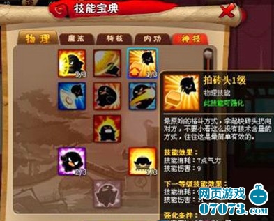 每一种神技具有七个等级,玩家领悟出神技之后,可以鼠标左键单击该神技图标强化技能。强化神技没有等级要求,但需要消耗一定量的【天书残卷】。强化神技时,有一定几率失败。强化的技能等级越高,成功几率越小。