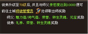 2、徒弟升级至35,45,55,65级时,师徒双方可获得升级奖励;