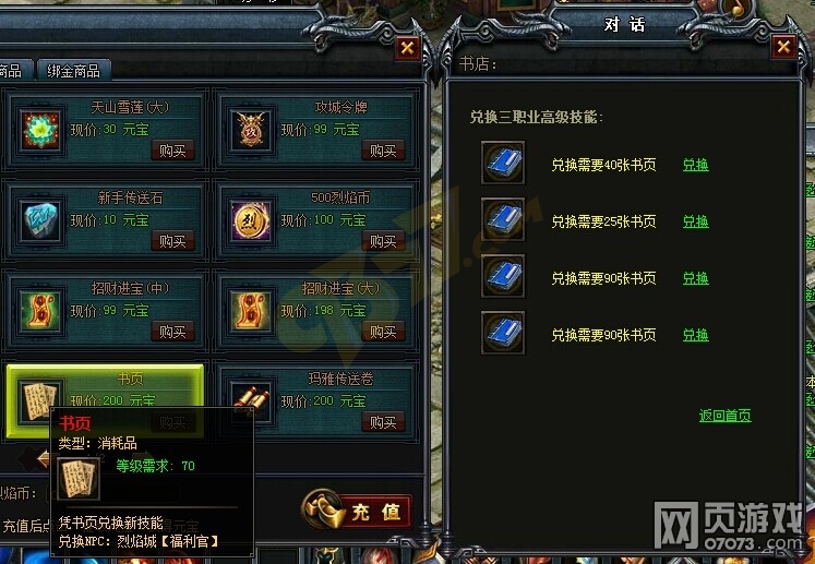 我们大家都知道游戏里,装备品质都是以红色品质最好的。恰巧烈焰书页也是一种红色品质的道具,可想而知书页必有其重要的价值所在。烈焰书页上面写满了非常潦草的书法,相信没几个玩家可以看得懂,唯有烈焰城中的NPC“福利官”和“书店”看懂其中的奥秘,他们是这些书页为至宝。玩家如果平时拾获到书页,就切勿扔掉。当收集一定数量的书页后,可以拿去给这两位NPC,经过他们的装订后,可以将这些书页合成大家所需的一些绝世武学秘笈哦。
