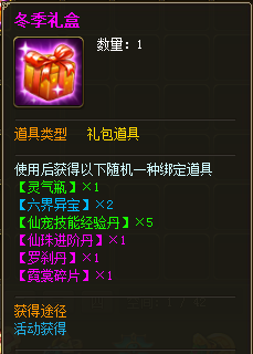 活动期间,参与日常副本玩法,完成每日百炼成仙任务,有一定几率获得【冬季礼盒】,开启【冬季礼盒】可以随机获得丰厚道具奖励哦,更有珍稀道具—霓裳碎片,可在轩辕鼎兑换精美时装!赶快行动吧!
