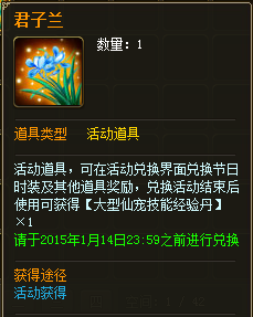活动期间,每消费300非绑定元宝(市场交易不包括在内),即可在“精彩活动”界面领取【君子兰】×1,【君子兰】可以在精彩活动中兑换各种珍贵奖励!