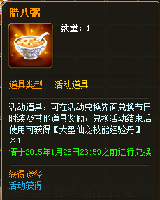 活动期间,每消费300非绑定元宝(市场交易不包括在内),即可在“精彩活动”界面领取【腊八粥】×1,【腊八粥】可以在精彩活动中兑换各种珍贵奖励!