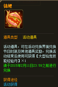 参与“消费送惊喜,锦鲤送祝福”活动获得的【锦鲤】,可兑换各种道具:唯爱风铃(增加火攻)、月下情魔(增加法防)、神宠宝盒、兽魂碎片等等,想兑就兑,兑由我心!