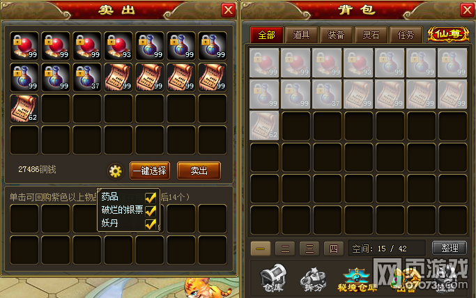 策划大大这次给我们带来一个非常人性化的改动,那就是一件卖出功能,可以很快地就把身上的药水和银票卖出哦!
