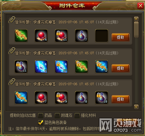 经过策划GG的努力,现在快速完成副本后,所掉落的蓝色装备也可以通过附件仓库下方的自动出售功能进行出售啦~
