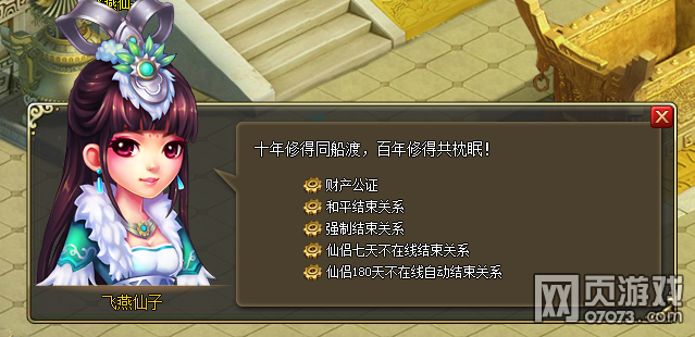 为了优化服务器环境、舒缓服务器压力,我们对仙侣离婚规则进行了调整,当仙侣任意一方离线时间大于等于180天,系统将自动结束仙侣关系,全部财产归另一方所有,且另一方可马上再次结缘~