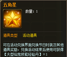 活动期间,每消费300非绑定元宝(市场交易不包括在内),即可在“精彩活动”界面领取【五角星】×1,【五角星】可以在精彩活动中兑换各种珍贵奖励!
