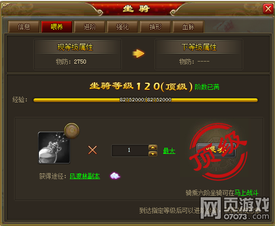 坐骑喂养等级的上限由原来的110级提升到现在的120级了,攻略风渡林副本以及喂养六界异宝可以提高坐骑的等级哟。