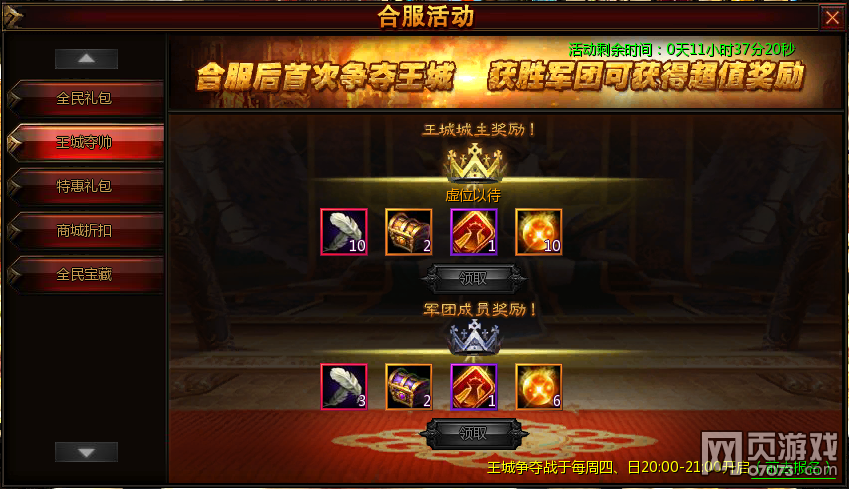 在合服后,首次获得王城军团的城主和军团成员都会获得丰厚奖励。