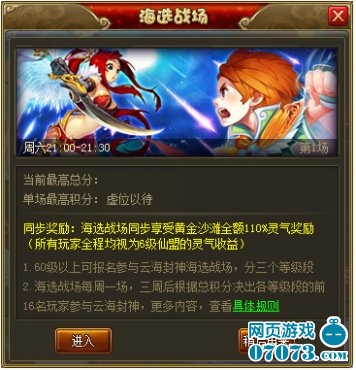海选战场将同步享受黄金沙滩全额110%的灵气奖励(所有玩家均视为6级仙盟灵气收益),如此宝贵的机会,千万不要错过!