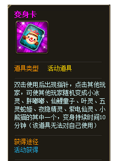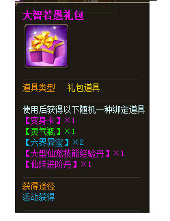 《六界版变形记》拍摄正式开始!你就是王牌导演噢!想把谁变成BB呢?想变就变,奇迹无限!活动期间,参与日常副本玩法,完成每日百炼成仙任务,有一定几率获得【大智若愚礼包】,开启【大智若愚礼包】可以随机获得丰厚道具奖励,更有机会获得【变身卡】,【变身卡】可以让玩家随机变成宠物形象,并且获得随机的人物属性哦~整人行动现在开始!