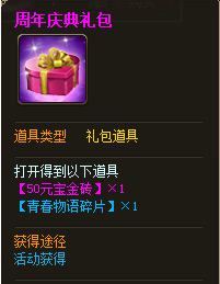 4月10日~4月15日,每天19:00—22:00保持在线,即可在“周年庆典”活动界面领取【周年庆典礼包】×1,打开周年庆典礼包可以获得【青春物语碎片】×1、【50元宝金砖】×1!活动期间,小伙伴们一定要记得准时上线喔!