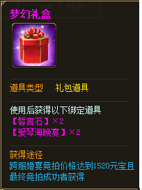 1、成功竞拍到次日跨服婚宴的仙侣,并且竞拍价格超过1520元宝,即可获得【梦幻礼盒】;