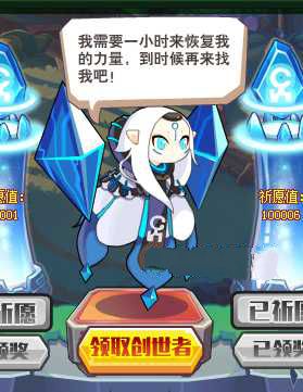洛克精灵战记祈愿的力量 得创世神卡拉 洛克精灵战记创世者卡拉的祈愿之力已经收集完成,即将恢复力量。守护到最后一刻,创世者将恢复力量,并幻化出它的分身,陪伴在勇者左右。
