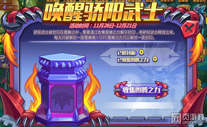 参加唤醒骄阳武士活动,通过收集图腾,解开封印,就可以将骄阳武士释放出来哦