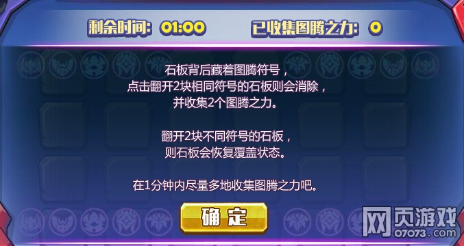 1、石板背后藏着图腾符号,点击翻开2块相同符号的石板则会消除,并收集2个图腾之力。