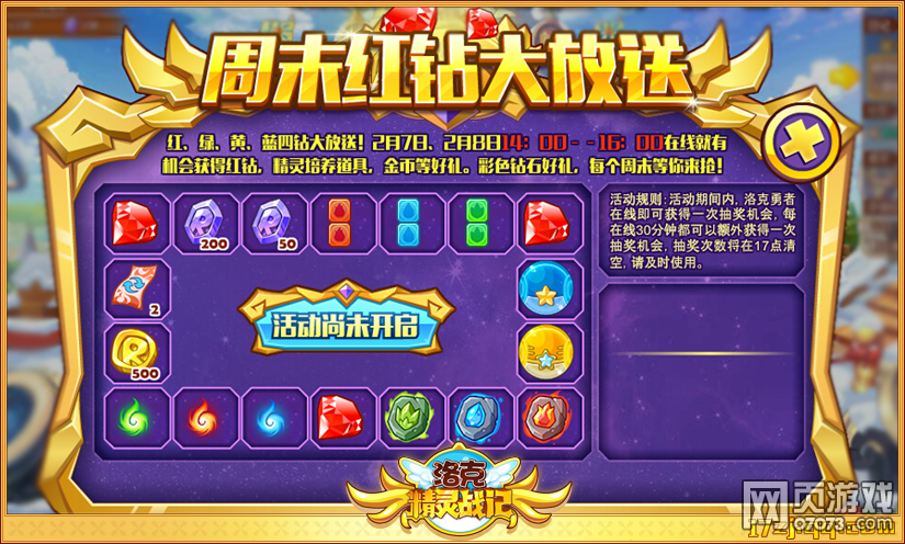 2月7日、8日14:00-16:00,在线就可以获得一次抽奖机会,用于抽取红钻、精灵培养道具,金币等好礼。每在线30分钟还可以再获得1次抽奖机会。