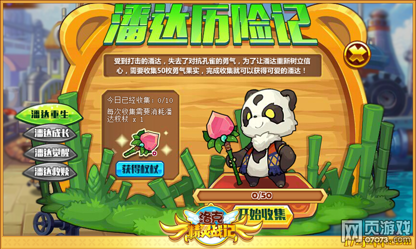 身心受创的潘达失去了对抗孔雀的勇气,快使用潘达法杖砸开勇气罐,寻找勇气果实,树立潘达信心。收集100个勇气果实就可以获得潘达!
