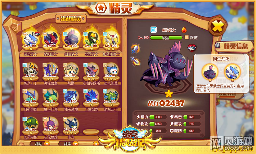 点击右下角“精灵”按钮,出现精灵面板。若某只精灵与其他精灵有羁绊,其头像上会有奇缘标签;对应的详细精灵信息上,还会有图标和悬浮提示说明:哪些精灵与它有奇缘关系,当共同出战时将会获得哪些额外的增益,比如提升自身属性、彼此分担伤害、互相鼓舞士气等。