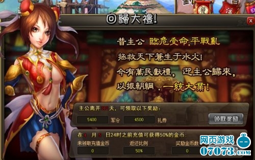 1) 回归用户在活动时间内进行充值还可获得50%的额外金币奖励,向下取整。