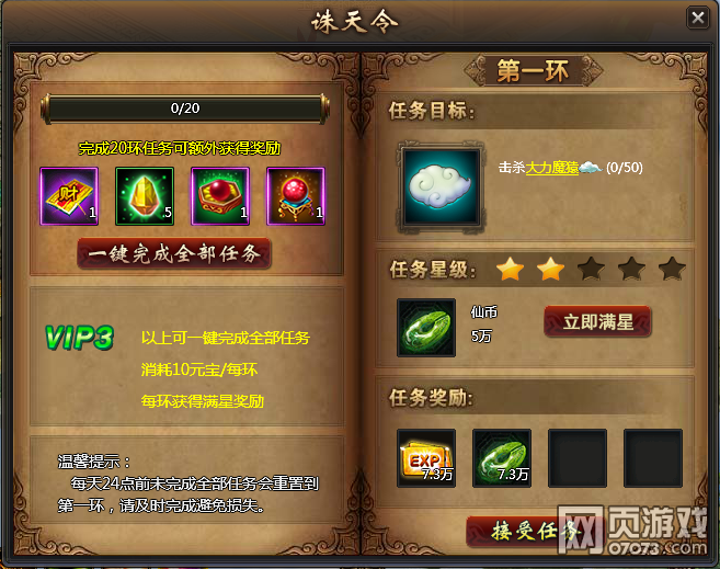 龙破九天诛天令是玩家经验的重要来源,每天可以完成20环的诛天令任务,不同的星级任务完成后可获得的奖励不同,VIP3级以上的玩家还可以选择一键完成全部任务,每天完成全部20环的任务还可以领取额外奖励。