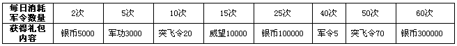 【内容】在此期间,玩家每天消费军令的数量累积达到2次、5次、10次、15次、25次、40次、50次、60次时,均可获得“奋战不休包”。