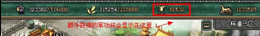 【注意事项】 玩家额外获得的20%军功将会直接在主界面右上方自动添加(如下图),战斗完成画面仅显示100%状态下的获取值,请您知晓。