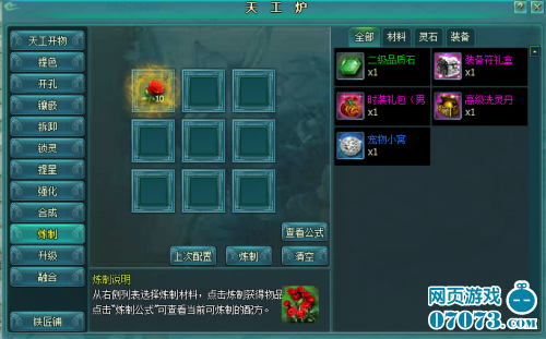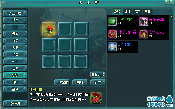 炼制界面调整为九宫格形式,玩家可查看公式,了解自己需要炼制的物品;可点击右侧炼制材料,选择放入的材料数量;还可使用“上次配置”功能,快速炼制物品。