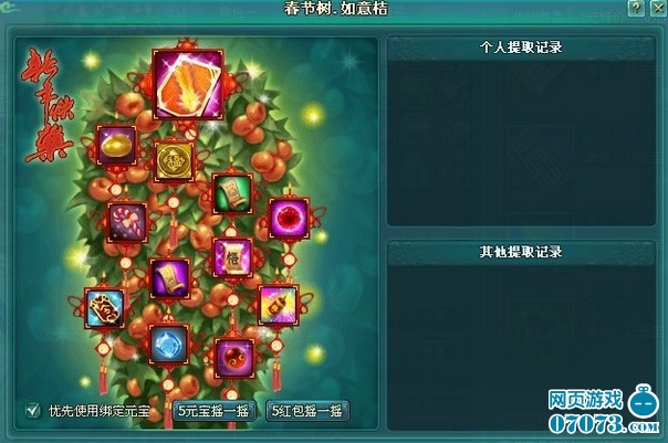 春节期间,京城如意桔树上挂满了礼物。摇一摇将有意想不到的惊喜哦。与京城的『如意桔』对话,弹出界面,可使用5元宝或者5个【红包】摇一摇,为您新年摇来好运气!