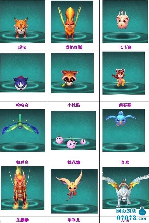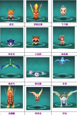 包括有:虎宝、烈焰红狐、飞飞猪、小浣熊、哈哈奇、相思鸟、棉花糖、大象、水龙吟、白虎、考拉、青鸾、年兽、貔貅、圣麒麟、蝶恋花、凤凰、乖乖龙、穷奇、蹦啾猫。