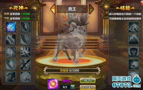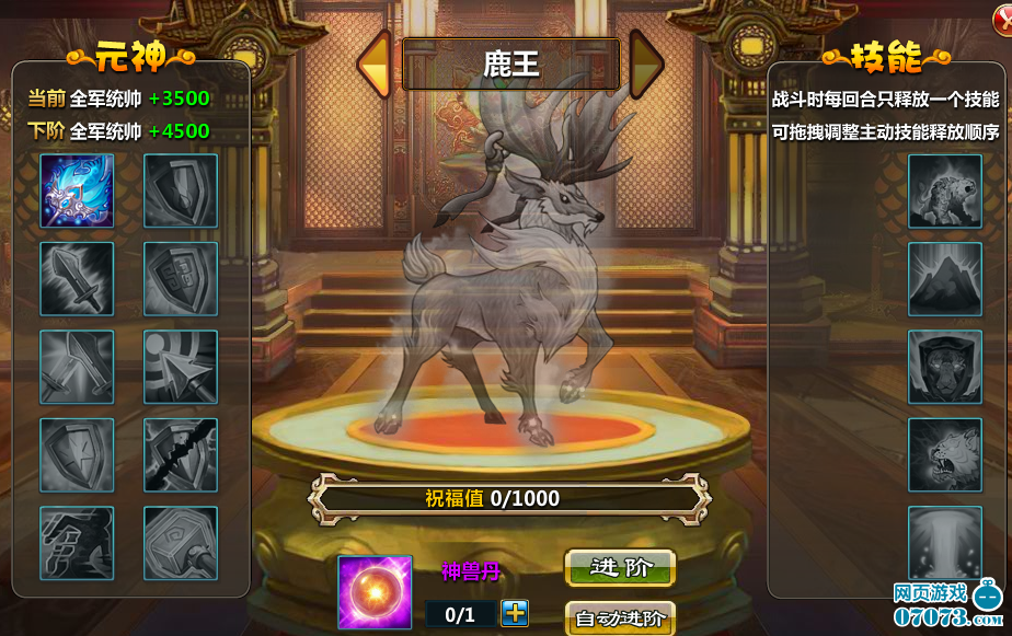 有玩家疑惑它们为什么属性一样,其实那个鹿王还没升级,所以看不到。鹿王多一个被动加谋防3000,和一个技能战神附体..神兽都是坑钱的。非RMB玩家要多存丹去升。