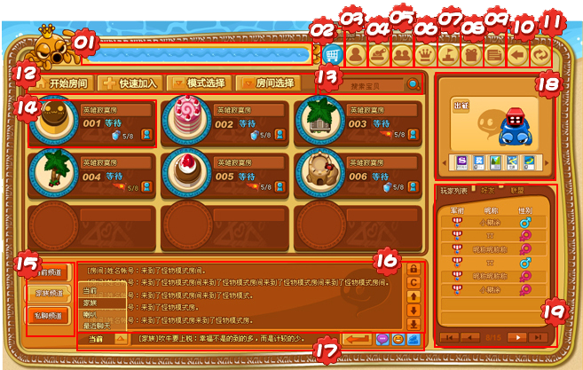 模式切换:点击怪物模式,对战模式,群聊模式可以继续三个模式之间房间列表的切换;点击各模式后的“开设房间”则可打开开设房间界面开设一个新的房间(详见开设房间栏目);点击“快速加入”则可以快速加入一个已经别的玩家已经开设好的房间;点击“房间选择”可以在房间列表显示战斗中房间和等待中房间