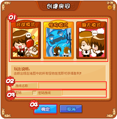 房间模式:房间模式暂为怪物模式,对战模式和聊天模式三种;