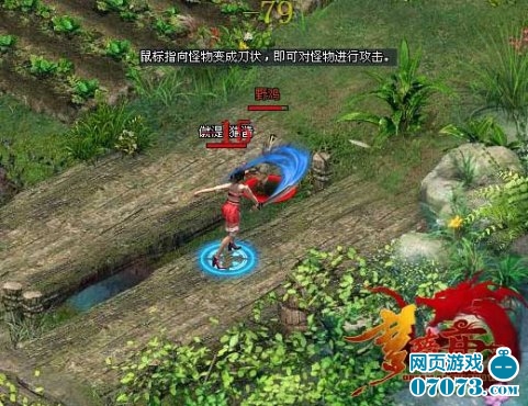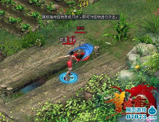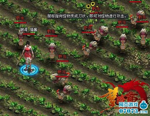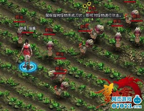 在野外周边分布着大量的野外怪物,鼠标停留在怪物身后,鼠标将变成短剑,单击左键,您将进入战斗状态并对怪物进行连续攻击。在战斗过程使用技能将将助你一臂之力。怪物死亡后,您会获得一定数量的经验值,而且可以拾取怪物掉落的物品。拾取的方法可以是走近选中物品点击左键拾取。