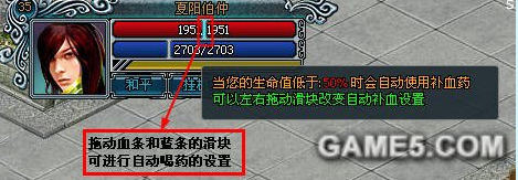 战斗过程中,要时刻观察自己的生命值,通过调节角色头像上的滑动条,可设置补红补蓝的百分比,如下图: