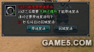 10级以上的玩家死亡后,选择回城复活,则立即传会主城?扬州复活;若不做任务操作,则倒计时30秒后传回主城?扬州复活;若选择原地复活需消耗道具【九转还魂丹】如下图: